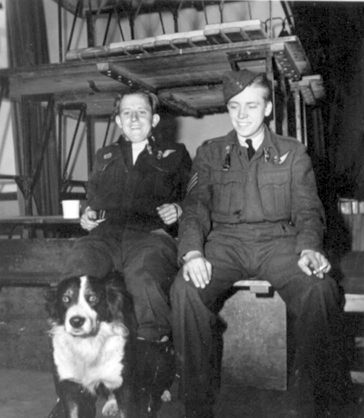 L - R: Sgt Lloyd Weston and dog, a mid upper gunner and Sgt P. Wiens
