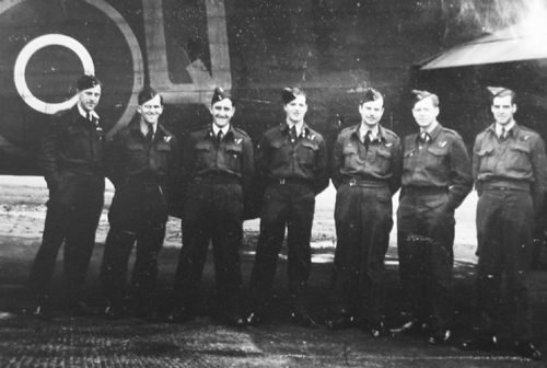 The T. Dennett Crew of 425 Squadron standing in front of Halifax