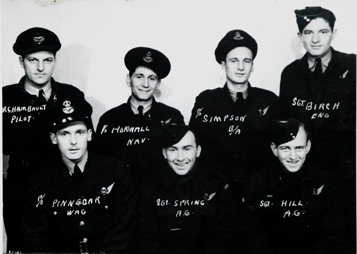 Front L to R: P/O A. Pinnegar RCAF, Wireless op; Sgt G. Spring RCAF, Mid-upper gunner; and Sgt H. Hill RCAF, Rear gunner.