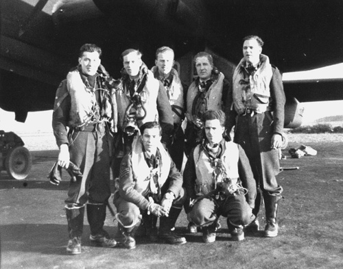 An unidentified Crew of 427 Squadron standing in front of a Halifax V ZL-Q.